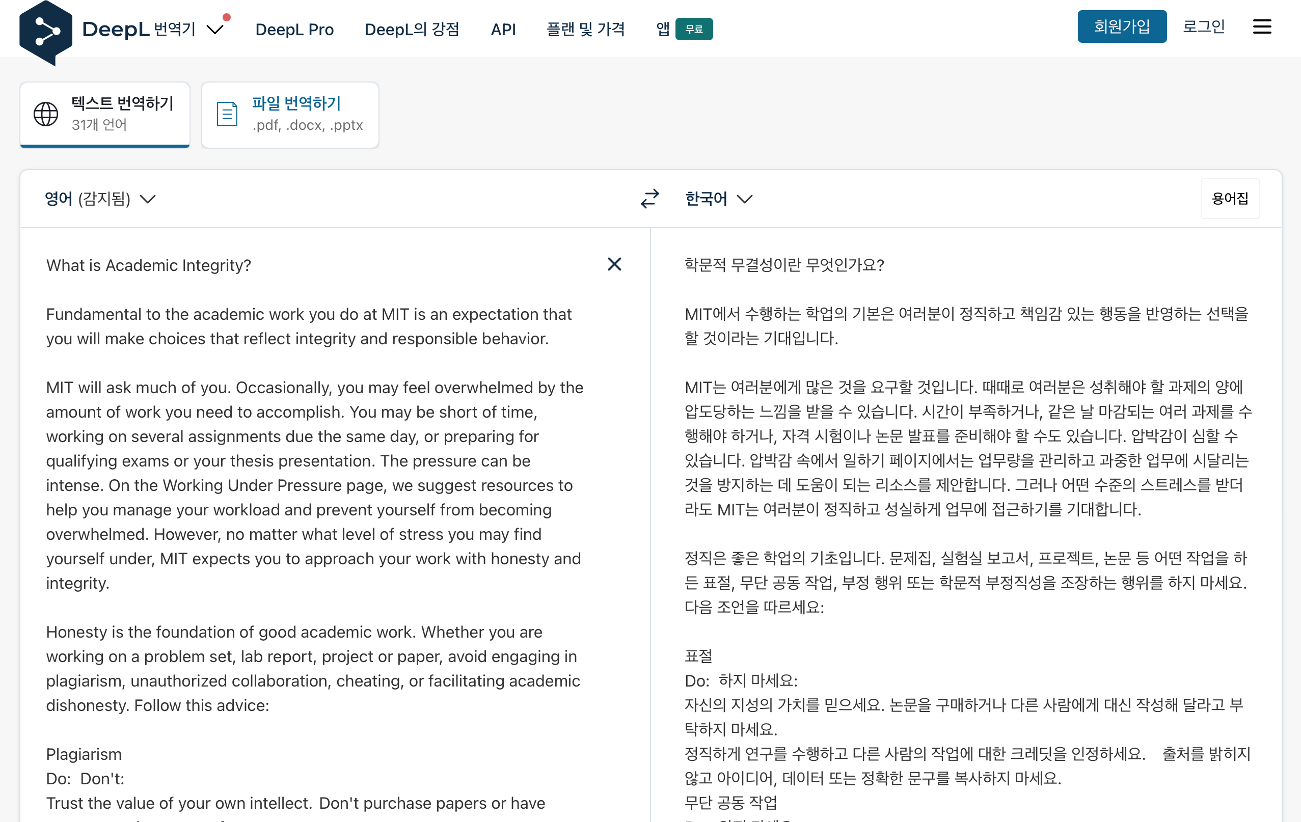 deepl.com 주소로 접속합니다. 회원가입 없이 무료로 이용 가능하며 한 번에 5000자까지 번역할 수 있습니다. 작은 글씨체로 빼곡하게 글이 적힌 원서 학문도서일 경우, 한 페이지를 드래그해서 번역했을 때 딱 5000자 미만으로 나옵니다. 한 페이지 씩 번역하여 사용하기에 분량이 딱 적절했습니다. 아래 사진처럼 Mit 대학 홈페이지에 나와있는 Academic Integrity에 대한 글을 드래그해서 번역해보았습니다.